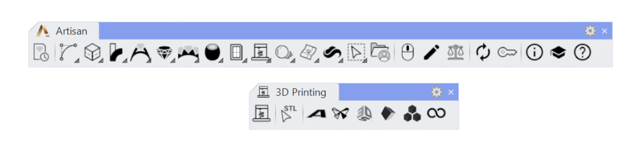 Within this tab, you will find commands to 3D print your design, from a tool that helps save your model in STL format, to our integrations with the most popular 3D printer slicer software.