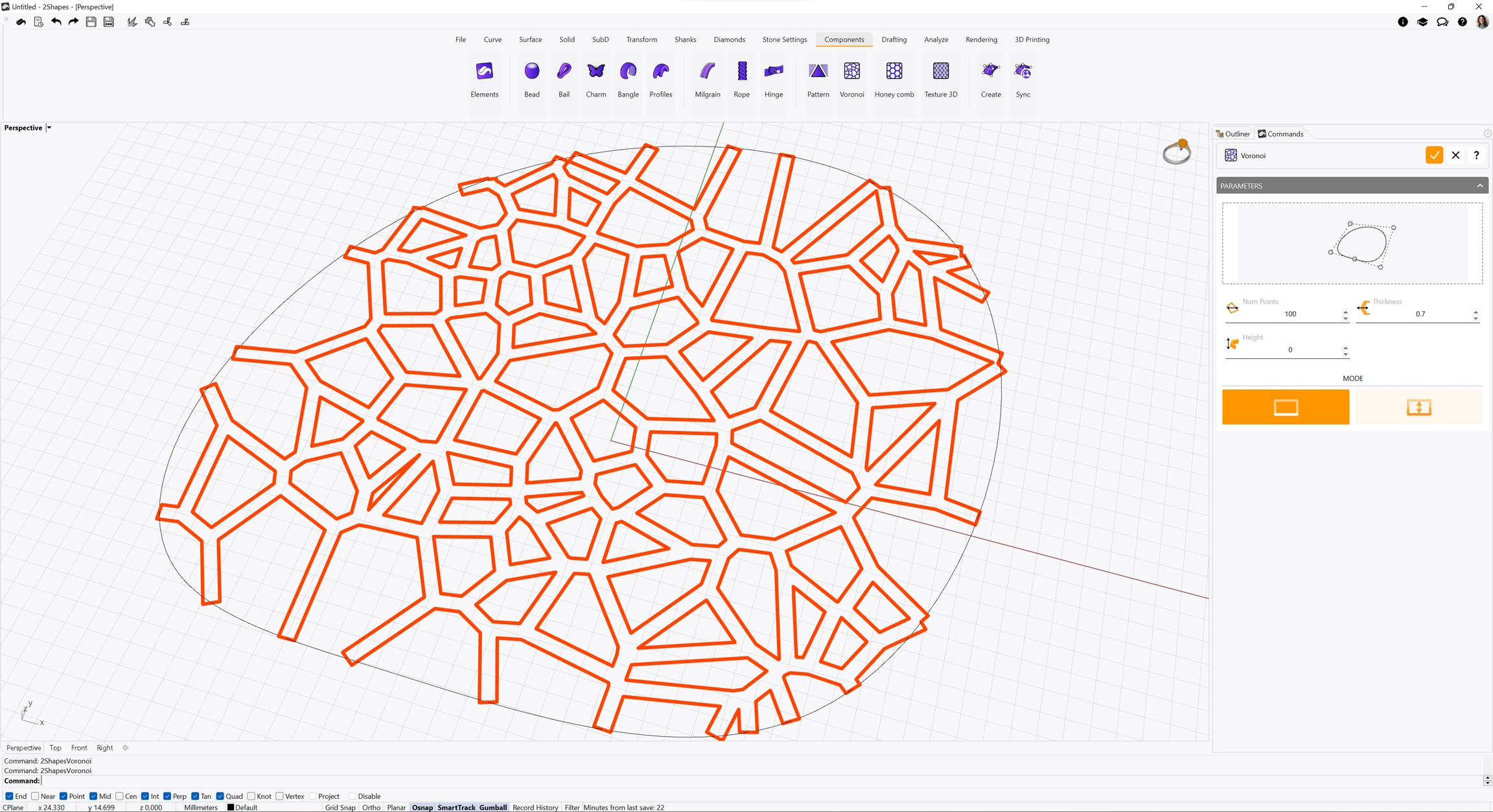 VoronoiWith this command, you can select a closed curve, and 2Shapes will fill it with a random and unique Voronoi pattern. It's especially useful for filling up hollowed designs and creating gorgeous organic-like patterns.