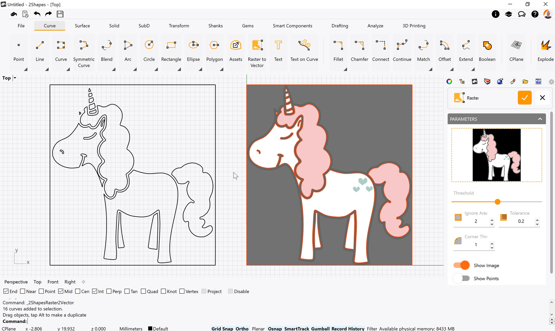 Raster to VectorThis command allows you to convert an image into a group of curves. It's especially useful to translate images into 3D models.