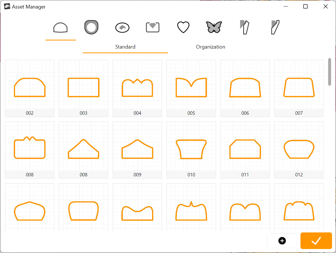 Here you can find all the Assets you have in your organization. The first row of icons represent the Asset type, and the second row separates Standard Assets provided to you by 2Shapes, and Organization Assets, which are the ones you have created and saved so far.