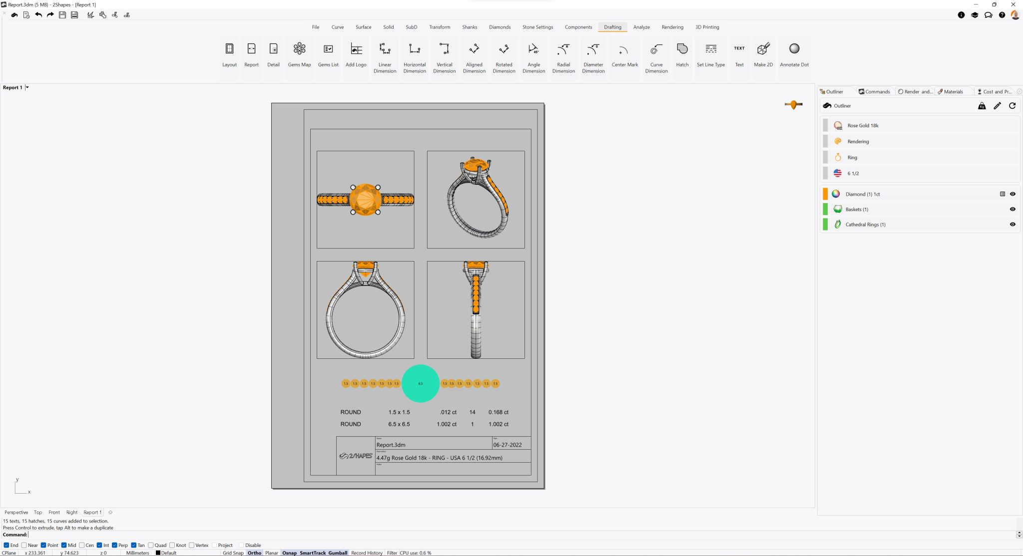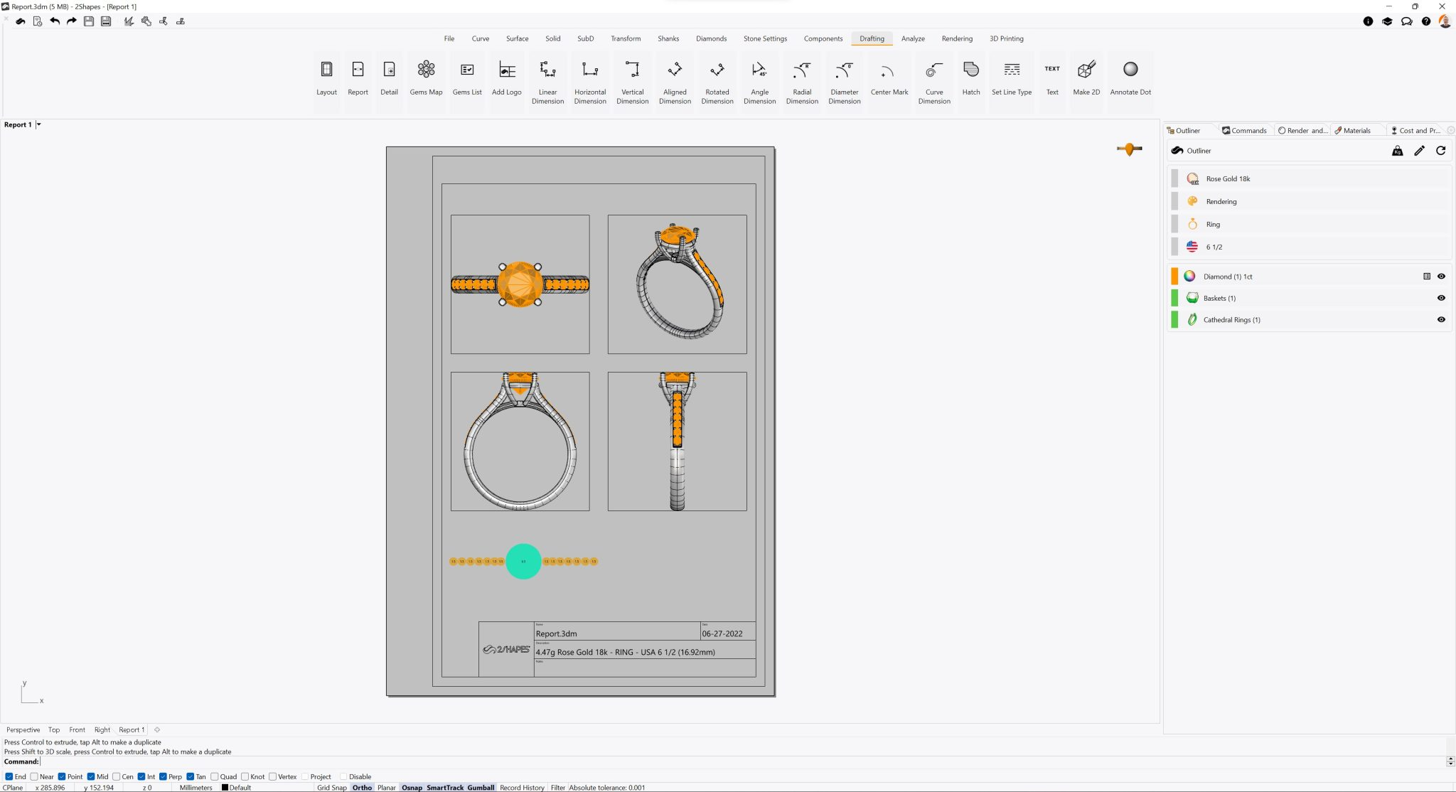 Gems MapUsing this command, you can generate a graphic representation in 2D of the gems of your design, their placement, and their weight in carats.