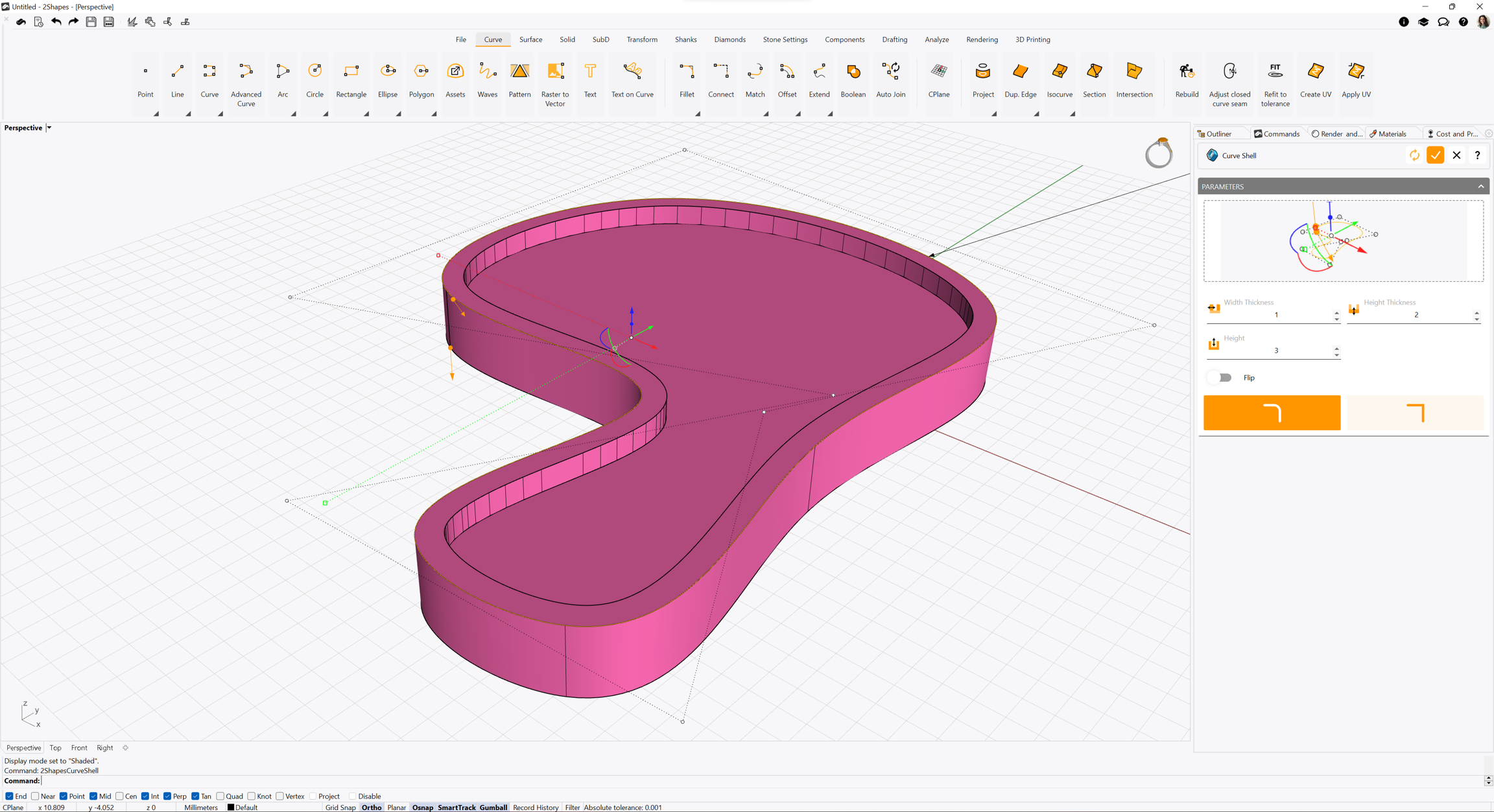 Once you confirm your changes, the Curve Shell object will be listed on the Outliner toolbar.