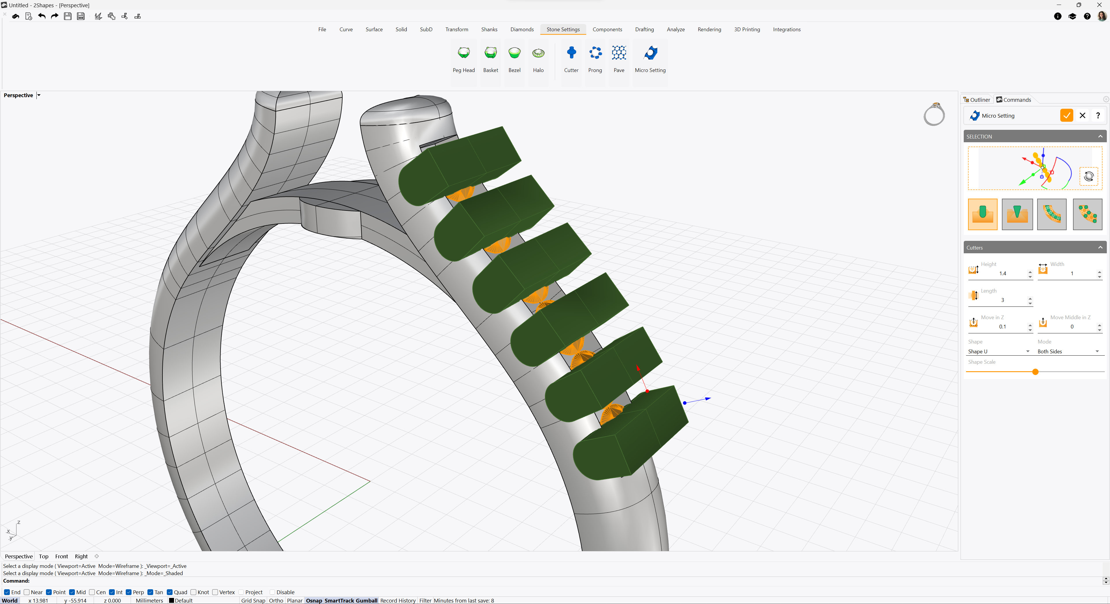 Running this command will display its parameters in the Commands toolbar. To select the gems you want to have cutters, click on the selection square on top of the menu, and then click on the gems. Here you can find the measurements of the different parts of the cutters. You can also choose one of the presets at the bottom.