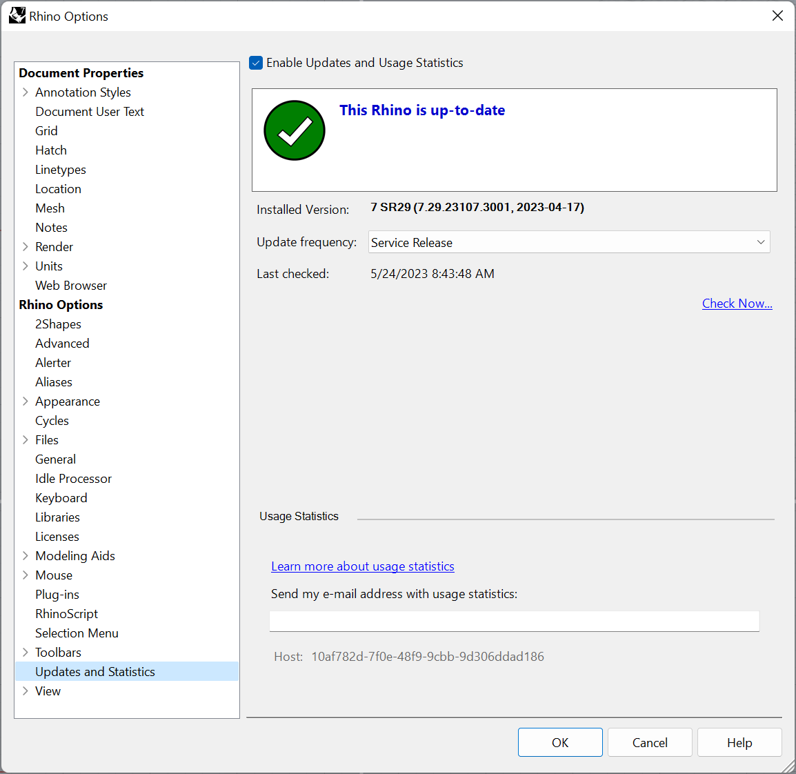 We recommend checking the Enable updates and usage statistics option. You will check for new updates every time you run Rhino.