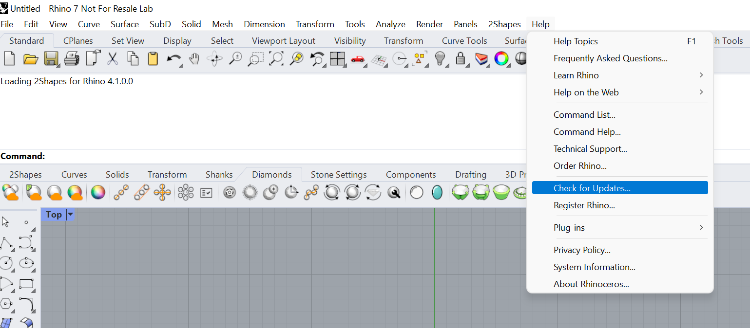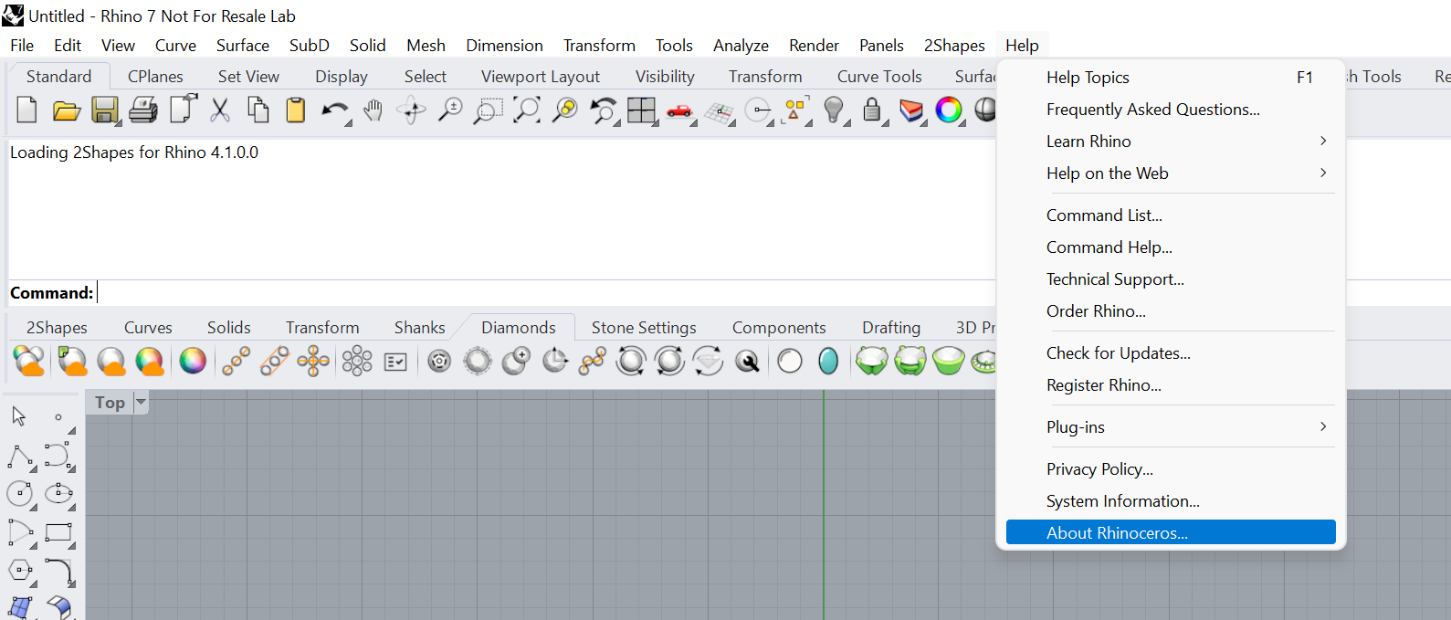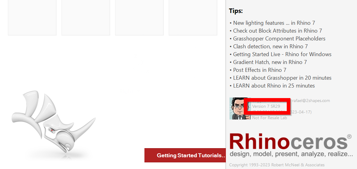 Let's check what Rhino version we are using. To do this, we will open Rhino, in the menu Help > About Rhinoceros.