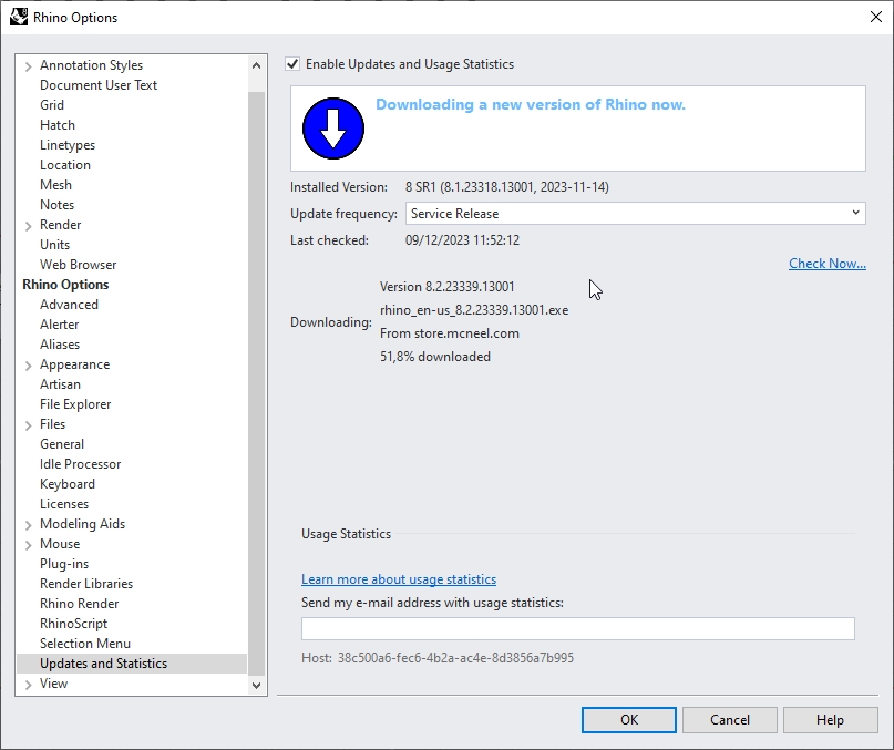 Let's check what Rhino version we are using. To do this, we will open Rhino, in the menu Help > Check for Updates...