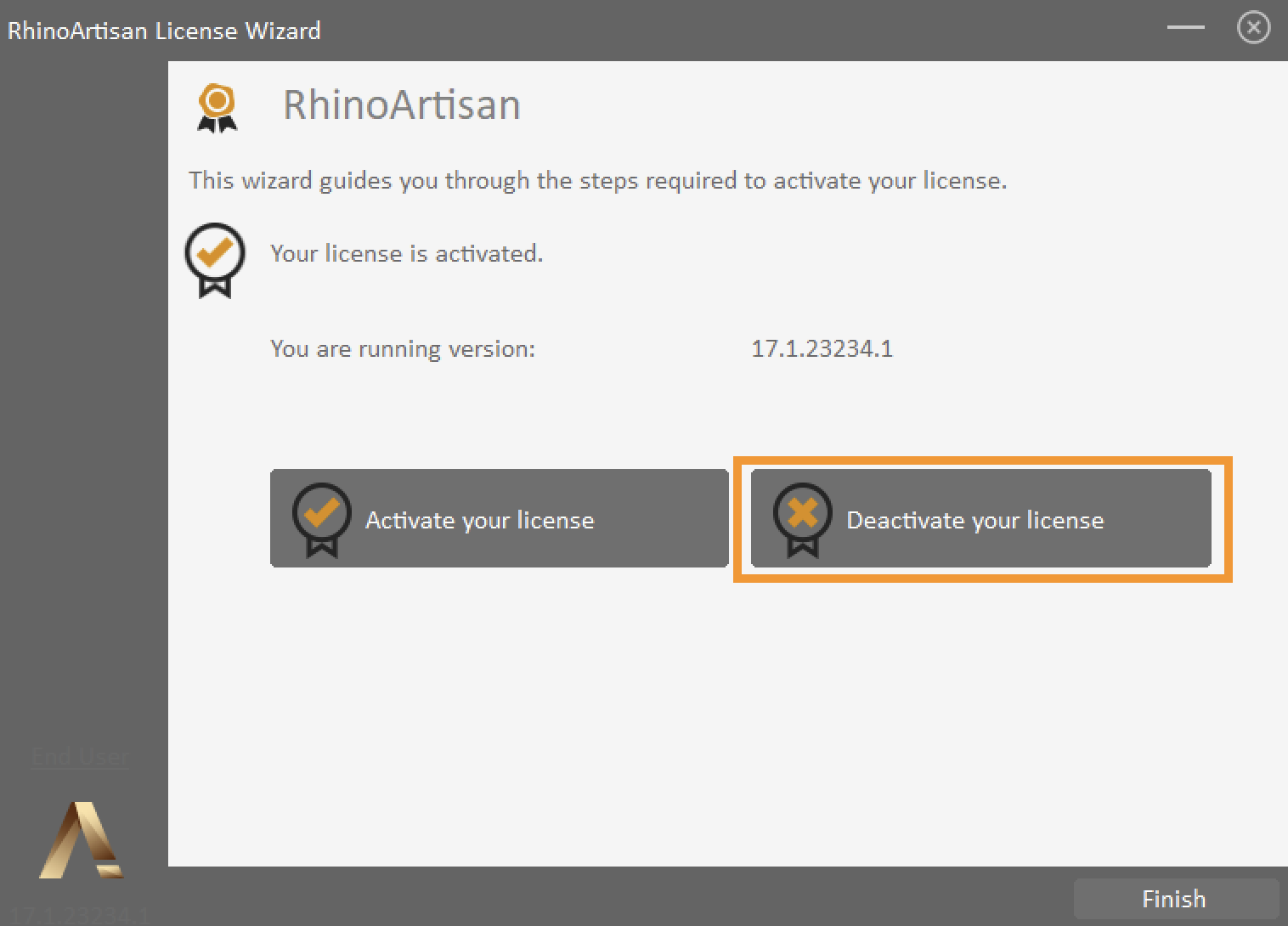 RhinoArtisan License Wizard will appear. Next click the **Deactivate your license** button, and then click the **Deactivate** button.