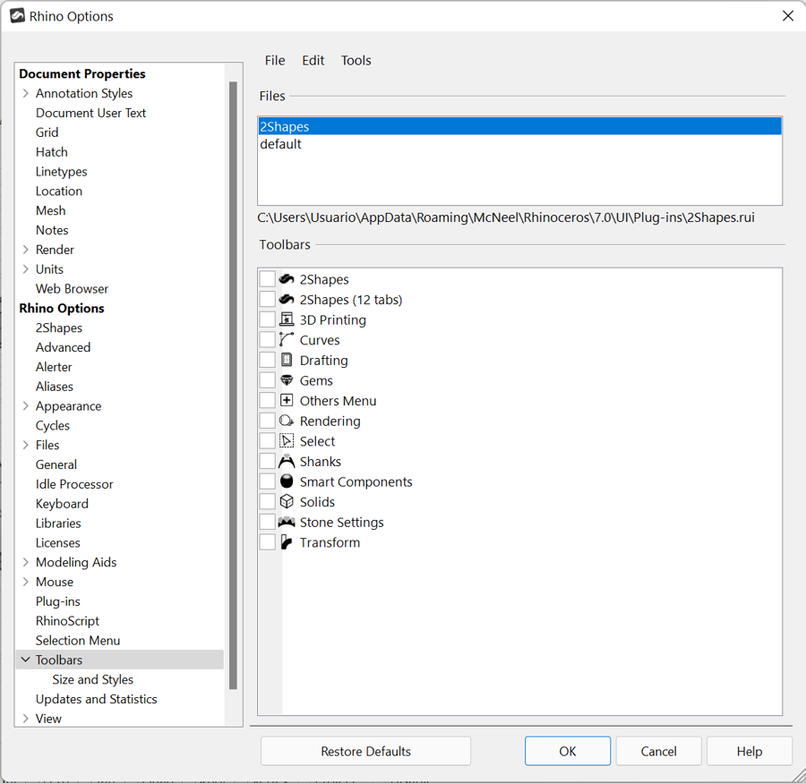 If you click on the 2Shapes item on this menu, you will see the available toolbars you can activate in the space below.